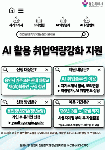 [»çȸ] ¿ëÀÎÆ¯·Ê½Ã, AI Ȱ¿ë Ãë¾÷¿ª·®°­È­ Áö¿ø»ç¾÷ û³â 300¸í ¸ðÁý |2026. 03.02