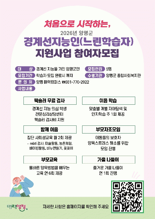 [NWS¹æ¼Û=Çѽ¸ñ ±âÀÚ]¾çÆò±ºÀº 2026³â óÀ½À¸·Î ÃßÁøÇÏ´Â ¡®°æ°è¼±Áö´ÉÀÎ(´À¸°ÇнÀÀÚ) Æò»ýÇнÀ Áö¿ø »ç¾÷¡¯¿¡ Âü¿©ÇÒ ÇнÀÀÚ¸¦ 4¿ùºÎÅÍ º»°Ý ¸ðÁýÇÑ´Ù°í ¹àÇû´Ù. À̹ø »ç¾÷Àº 2023³â ¡®¾çÆò±º °æ°è¼±Áö´ÉÀÎ Áö¿ø Á¶·Ê¡¯ Á¦Á¤ ÀÌÈÄ °ü°è¡¦
