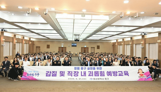 [NWS¹æ¼Û=Çѽ¸ñ ±âÀÚ]¿ï»ê Áß±¸°¡ 5¿ù 21ÀÏ ¿ÀÈÄ 2½Ã Áß±¸Ã» ´ëȸÀǽǿ¡¼­ °£ºÎ °ø¹«¿ø°ú ½Å±Ô ÀÓ¿ëÀÚ, ½ÂÁøÀÚ µî Á÷¿ø 250¿© ¸íÀ» ´ë»óÀ¸·Î °©Áú ¹× Á÷Àå ³» ±«·ÓÈû ¿¹¹æ ±³À°À» ÁøÇàÇß´Ù. À̹ø ±³À°Àº Á÷Àå ³» ±«·ÓÈû¿¡ ´ëÇÑ °æ°¢½ÉÀ»¡¦