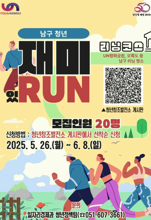 [NWS¹æ¼Û=Çѽ¸ñ ±âÀÚ]ºÎ»ê ³²±¸´Â ³²±¸Ã» °³Ã» 50ÁÖ³âÀ» ¸ÂÀÌÇÏ¿© û³âÀÇ °Ç°­ ÁõÁø°ú Áö¿ª»çȸ ±³·ù¸¦ Ȱ¼ºÈ­Çϱâ À§ÇÑ Ã»³â Âü¿©Çü ·¯´× ÇÁ·Î±×·¥ÀÎ '2025 ³²±¸ û³â, Àç¹ÌÀÖRUN'À» 6¿ùºÎÅÍ º»°Ý ¿î¿µÇÑ´Ù°í ¹àÇû´Ù. À̹ø ÇÁ·Î±×·¥Àº¡¦