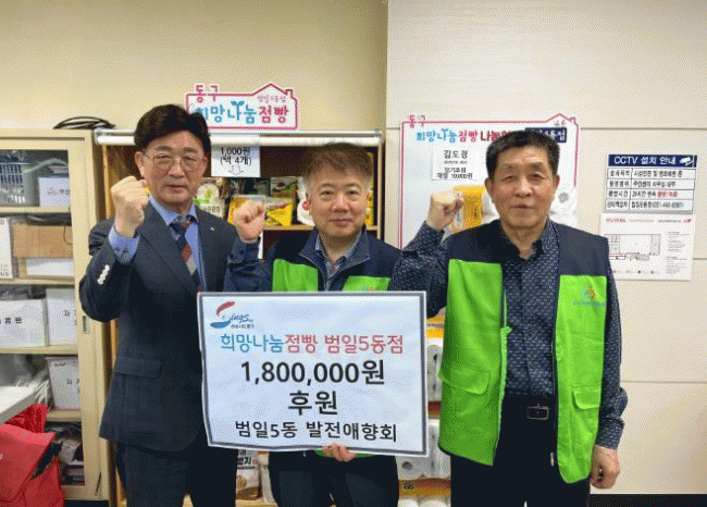 [NWS¹æ¼Û=Çѽ¸ñ ±âÀÚ] ºÎ»ê µ¿±¸ ¹üÀÏ5µ¿ ¹ßÀü¾ÖÇâȸ´Â Áö³­ 20ÀÏ Èñ¸Á³ª´®Á¡»§ ¹üÀÏ5µ¿Á¡¿¡ 180¸¸¿øÀ» ÈÄ¿øÇß´Ù. ÈÄ¿ø±ÝÀº °æÁ¦ÀûÀ¸·Î ¾î·Á¿òÀ» °Þ´Â Áֹο¡°Ô »ýÇÊǰ µîÀ» Áö¿øÇÏ´Â ¡®Èñ¸Á³ª´®Á¡»§¡¯ ¿î¿µ¿¡ »ç¿ëµÉ ¿¹Á¤ÀÌ´Ù. ¡¦