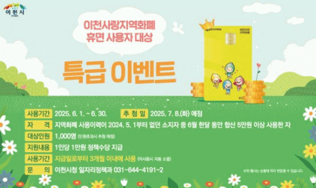 [NWS¹æ¼Û=ÇãÀº¼­ ±âÀÚ]ÀÌõ½Ã´Â Áö¿ª ³» ¼Òºñ ÁøÀÛÀ» À§ÇØ ÀÌõ»ç¶û Áö¿ªÈ­Æó ÈÞ¸é »ç¿ëÀÚ¸¦ ´ë»óÀ¸·Î Ư±ÞÀ̺¥Æ®¸¦ ÇÑ´Ù°í ¹àÇû´Ù. Áö¿ªÈ­Æó ÃæÀü ÀÌ·ÂÀÌ 2024³â 5¿ù 1ÀϺÎÅÍ Çѹøµµ ¾ø´Â »ç¿ëÀÚ°¡ ´Ù°¡¿À´Â 6¿ù 1ÀϺÎÅÍ 6¿ù 30ÀϱîÁö ¡¦