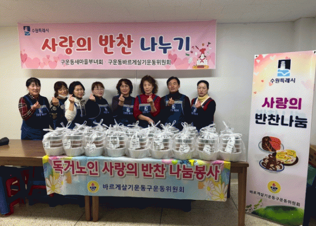 [NWS¹æ¼Û=Çѽ¸ñ ±âÀÚ]±¸¿îµ¿ ¹Ù¸£°Ô»ì±â¿îµ¿À§¿øÈ¸´Â 29ÀÏ ¡®»ç¶ûÀÇ ¹ÝÂù ³ª´®' ºÀ»çȰµ¿À» ½Ç½ÃÇß´Ù. ÀÌ ³¯ ¹Ù¸£°Ô»ì±â¿îµ¿À§¿øÈ¸ ȸ¿ø 10¸íÀÌ ÀDZâÅõÇÕÇÏ¿© ¹Ý°èÅÁ, ÄáÀÚ¹Ý, °íµî¾îÁ¶¸², ¹«»ýä, ¹Ì³ª¸®¹«Ä§ ¹ÝÂùÀ» ¸¸µé¾î ±¸¿îµ¿ °ü¡¦