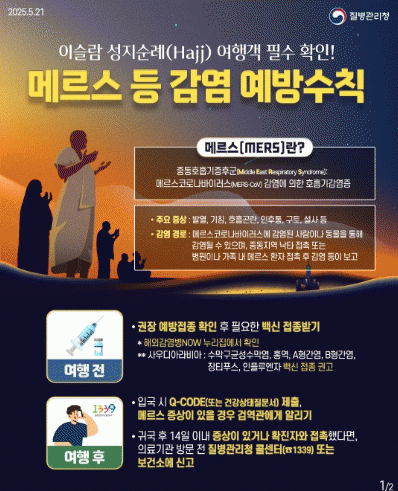 [°Ç°­] Áúº´°ü¸®Ã», À̽½¶÷ ÇÏÁö(HAJJ) ¼ºÁö¼ø·Ê ±â°£ Áßµ¿È£Èí±âÁõÈıº(¸Þ¸£½º), ¼ö¸·±¸±Õ °¨¿°Áõ ÁÖÀÇÇϼ¼¿ä |2025. 05.21