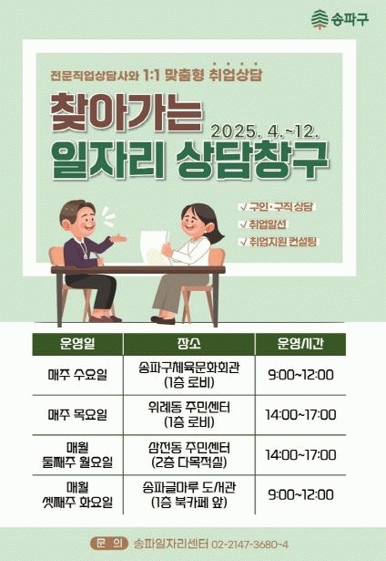 [»çȸ] Á÷¾÷»ó´ã»ç°¡ Á÷Á¢ ã¾Æ°©´Ï´Ù! ¼ÛÆÄ±¸, 'ã¾Æ°¡´Â ÀÏÀÚ¸® »ó´ãⱸ' 12¿ù±îÁö |2025. 05.21
