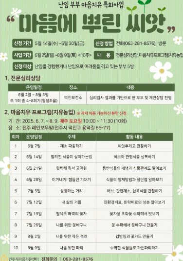 [NWS¹æ¼Û=Çѽ¸ñ ±âÀÚ]ÀüÁֽà ¸¶À½Ä¡À¯¼¾ÅÍ´Â ³­ÀÓ ºÎºÎ¸¦ À§ÇÑ Æ¯º° Ä¡À¯ ÇÁ·Î±×·¥ ¡®¸¶À½¿¡ »Ñ¸° ¾¾¾Ñ¡¯À» ¿À´Â 6¿ùºÎÅÍ 8¿ù±îÁö 10ÁÖ°£ ¿î¿µÇÑ´Ù. ÀÌ ÇÁ·Î±×·¥Àº ³­ÀÓÀ¸·Î ÀÎÇØ ¿ì¿ï°¨°ú Á¤¼­Àû ¾î·Á¿òÀ» °Þ´Â ºÎºÎ 5½ÖÀ» ´ë»óÀ¸·Î ¡¦