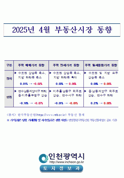 [NWS¹æ¼Û=Çѽ¸ñ ±âÀÚ]ÀÎõ±¤¿ª½Ã´Â 2025³â 4¿ù ÁÖÅà ¸Å¸Å°¡°ÝÀÌ Ç϶ôÇßÀ¸³ª, Ç϶ôÆøÀº 4°³¿ù ¿¬¼Ó ÁÙ¾îµé¾ú´Ù°í ¹àÇû´Ù. ÀÎõ½Ã°¡ Çѱ¹ºÎµ¿»ê¿øÀÇ ºÎµ¿»ê Åë°èÁ¤º¸¸¦ ºÐ¼®ÇØ ¹ßÇ¥ÇÑ ¡®2025³â 4¿ù ºÎµ¿»ê½ÃÀå µ¿Çâ º¸°í¼­¡¯¿¡ µû¸£¸é, 4¡¦