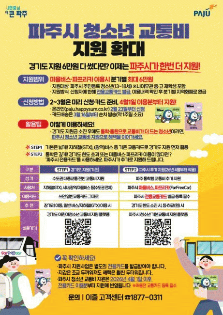 [NWS¹æ¼Û=Çѽ¸ñ ±âÀÚ]ÆÄÁֽô û¼Ò³âÀÇ ÅëÇÐ ±³Åëºñ ºÎ´ãÀ» ½ÇÁúÀûÀ¸·Î ÁÙÀ̱â À§ÇØ ±âÁ¸ °æ±âµµ û¼Ò³â ±³Åëºñ Áö¿ø»ç¾÷°ú º°°³·Î, ÆÄÁֽà ¿©°Ç¿¡ ¸ÂÃá ¡®ÆÄÁֽà û¼Ò³â ±âº»±³Åëºñ Áö¿ø»ç¾÷(ÆÄÇÁ·»Áî)¡¯À» ¿À´Â 4¿ùºÎÅÍ ½ÃÇàÇÑ´Ù. '¡¦