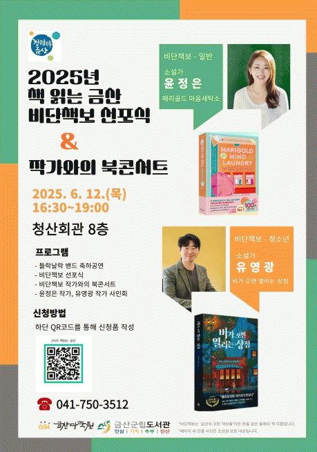 [NWS¹æ¼Û=Çѽ¸ñ ±âÀÚ]±Ý»ê±ºÀº 19ÀϺÎÅÍ Ã¥ Àд ±Ý»ê ¿ÃÇØÀÇ Ã¥ ¼±Æ÷½Ä ¹× ºÏÄܼ­Æ® Âü¿©ÀÚ 100¸íÀ» ¼±Âø¼ø ¸ðÁýÇÑ´Ù. ÀÌ Çà»ç´Â 6¿ù 12ÀÏ ±Ý»êÀ¾ û»êȸ°ü¿¡¼­ ¿­¸®¸ç ¡®¸Þ¸®°ñµå ¸¶À½¼¼Å¹¼Ò¡¯ À±Á¤Àº ÀÛ°¡, ¡®ºñ°¡ ¿À¸é ¿­¸®´Â »óÁ¡¡¦