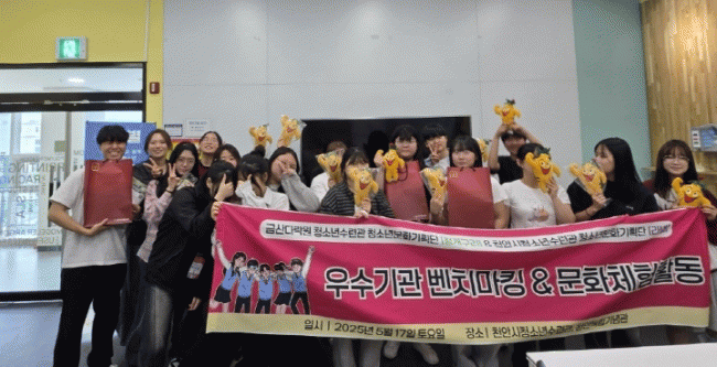 [NWS¹æ¼Û=Çѽ¸ñ ±âÀÚ]±Ý»ê´Ù¶ô¿ø û¼Ò³â¼ö·Ã°üÀº Áö³­ 17ÀÏ Ãµ¾È½Ã ¹®È­µ¿¿¡ ¼ÒÀçÇÑ Ãµ¾È½Ãû¼Ò³â¼ö·Ã°ü¿¡¼­ Á¦2±â û¼Ò³â¹®È­±âȹ´Ü¿øµéÀÇ ¼ºÀå Áö¿øÀ» À§ÇÑ º¥Ä¡¸¶Å·À» Àü°³Çß´Ù. ÀÌ ½Ã¼³Àº Çб³¿Í õ¾È¿ª µî ÁÖ°Å´ÜÁö°¡ ¹ÐÁ¢ÇÑ ¹®È­¡¦