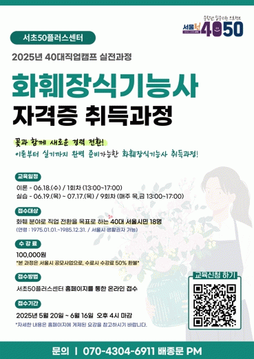 [»çȸ] ¼­Ãʱ¸, 40´ë Áß³âÃþ À§ÇÑ ¡®È­ÈÑÀå½Ä±â´É»ç ÀÚ°ÝÁõ Ãëµæ°úÁ¤¡¯ Âü¿©ÀÚ ¸ðÁý |2025. 05.18