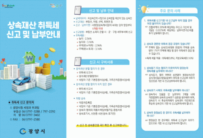 [NWS¹æ¼Û=Çѽ¸ñ ±âÀÚ]±¤¾ç½Ã´Â »ó¼ÓÀç»ê¿¡ ´ëÇÑ Ãëµæ¼¼ ½Å°í¡¤³³ºÎ ±âÇÑÀ» ³õÃÄ °¡»ê¼¼¸¦ ºÎ´ãÇÏ´Â »ç·Ê¸¦ ÁÙÀ̱â À§ÇØ ¾È³» È«º¸¸¦ °­È­ÇÑ´Ù°í 16ÀÏ ¹àÇû´Ù. ÇöÇà Áö¹æ¼¼¹ý¿¡ µû¸£¸é, »ó¼ÓÀº ÇÇ»ó¼ÓÀÎÀÇ »ç¸Á°ú µ¿½Ã¿¡ °³½ÃµÇ¸ç, »ó¼Ó¡¦