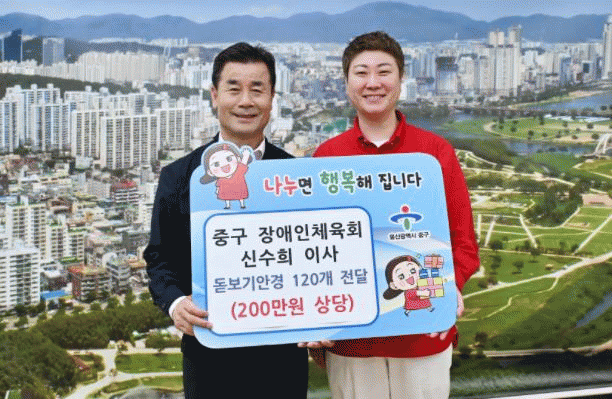 [NWS¹æ¼Û=Çѽ¸ñ ±âÀÚ]½Å¼öÈñ ¿ï»ê Áß±¸ Àå¾ÖÀÎüÀ°È¸ À̻簡 5¿ù 16ÀÏ ¿ÀÈÄ 2½Ã 30ºÐ Áß±¸Ã» ±¸Ã»Àå½ÇÀ» ã¾Æ ¿ï»ê»çȸº¹Áö°øµ¿¸ð±Ýȸ¸¦ ÅëÇØ Áö¿ª ¾î¸£½ÅÀ» À§ÇÑ 200¸¸ ¿ø »ó´çÀÇ µ¸º¸±â¾È°æ 120°³¸¦ Àü´ÞÇß´Ù. À̹ø Àü´Þ½Ä¿¡´Â ±è¿µ±æ¡¦