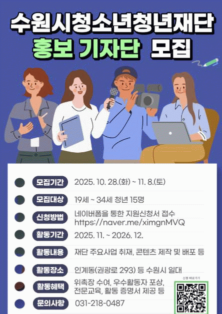 [»çȸ] ¼ö¿ø½Ãû¼Ò³âû³âÀç´Ü 'È«º¸ ±âÀÚ´Ü' 1±â ¸ðÁý |2025. 10.28