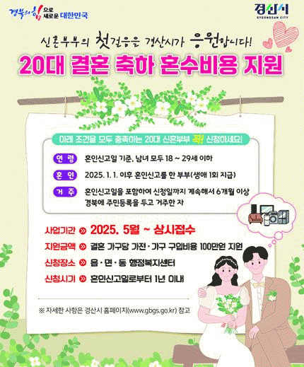 [»çȸ] ½ÅÈ¥ Ãâ¹ß, °æ»ê½Ã°¡ ÇÔ²²ÇÕ´Ï´Ù! 20´ë °áÈ¥ ÃàÇÏ È¥¼öºñ¿ë Áö¿ø ½ÃÀÛ |2025. 05.16