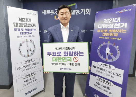 [NWS¹æ¼Û=Çѽ¸ñ ±âÀÚ]ÀüºÏƯº°ÀÚÄ¡µµ°¡ ¿À´Â 6¿ù 3ÀÏ ½Ç½ÃµÇ´Â Á¦21´ë ´ëÅë·É ¼±°Å¸¦ ¾ÕµÎ°í, µµ¹ÎÀÇ Àû±ØÀûÀÎ ÅõÇ¥ Âü¿© µ¶·Á¿¡ ³ª¼¹´Ù. ±è°ü¿µ Áö»ç´Â 16ÀÏ, SNS¸¦ ÅëÇØ ¡®ÅõÇ¥°¡ ¹Ì·¡¸¦ °áÁ¤ÇÕ´Ï´Ù¡¯¶ó´Â ¸Þ½ÃÁö¸¦ ÀüÇϸç, À̹ø ¼±°Å¡¦