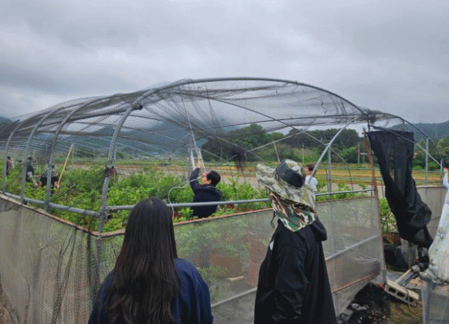 [NWS¹æ¼Û=Çѽ¸ñ ±âÀÚ] ¿µ±¤±º Ãà»ê½Äǰ°ú Á÷¿øµéÀº Áö³­ 15ÀÏ ´ë¸¶¸é ¼º»ê¸® ¼ÒÀçÇÑ ³ó°¡¸¦ ã¾Æ ºí·çº£¸® ²É µû±â, ÇϿ콺 Â÷±¤¸Á ¼³Ä¡ µî ³óÃÌ ÀÏ¼Õ µ½±â¿¡ ³ª¼¹´Ù. À̹ø ÀÏ¼Õ µ½±â´Â Ãà»ê½Äǰ°ú Á÷¿ø 17¸íÀÌ Âü¿©ÇØ ¿µ³óö ÀÏ¼Õ ºÎ¡¦