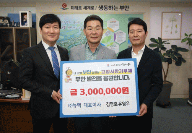 [NWS¹æ¼Û=Çѽ¸ñ ±âÀÚ]¢ß´ºÅØ ±è¸íÈ£¡¤À¯¿µ¿ì ´ëÇ¥°¡ Áö³­ 14ÀÏ ºÎ¾È±º °íÇâ»ç¶û±âºÎ±Ý 300¸¸¿øÀ» ±âŹÇϸç Áö¿ª¹ßÀüÀ» ÇâÇÑ Áø½É ¾î¸° ¸¶À½À» ÀüÇß´Ù. ´ºÅØÀº ¿ÏÁÖ±º ¼ÒÀç ÀÚµ¿Â÷ ºÎǰ Á¦Á¶ Àü¹® ±â¾÷À¸·Î Æò¼Ò ºÎ¾È¿¡ ´ëÇÑ °ü½É°ú ¾ÖÁ¤¡¦