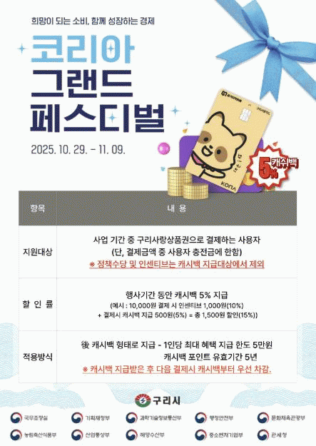 [»çȸ] ±¸¸®½Ã, 'ÄÚ¸®¾Æ ±×·£µå Æä½ºÆ¼¹ú' ¸Â¾Æ ±¸¸®»ç¶û»óǰ±Ç 5% Ãß°¡ Àû¸³ ½Ç½Ã |2025. 10.28