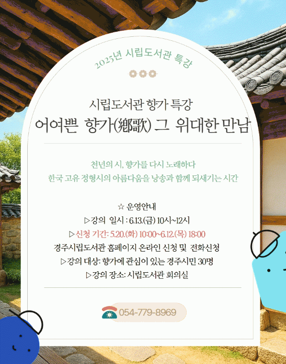 [NWS¹æ¼Û=Çѽ¸ñ ±âÀÚ]°æÁֽø³µµ¼­°üÀº ¿À´Â 6¿ù 13ÀÏ ¿ÀÀü 10½ÃºÎÅÍ 12½Ã±îÁö °æÁֽùÎÀ» ´ë»óÀ¸·Î Àι®ÇРƯ°­ ¡®¾î¿©»Û Çâ°¡, ±× À§´ëÇÑ ¸¸³²¡¯À» °³ÃÖÇÑ´Ù°í ¹àÇû´Ù. À̹ø Ư°­Àº Çѱ¹ °íÀ¯ÀÇ Á¤Çü½ÃÀÎ Çâ°¡¿¡ ´ã±ä Á¤½Å°ú ¿îÀ²À» ¡¦