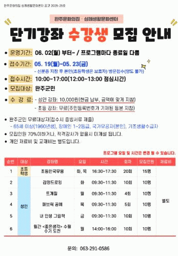 [NWS¹æ¼Û=Çѽ¸ñ ±âÀÚ]¿ÏÁÖ¹®È­ÀÇÁý¡¤»ï·Ê»ýȰ¹®È­¼¾ÅͰ¡ ÃʵîÇлýºÎÅÍ ¼ºÀαîÁö ´Ù¾çÇÑ ¿¬·ÉÃþÀÌ Âü¿©ÇÒ ¼ö ÀÖ´Â ´Ü±â°­Á ÇÁ·Î±×·¥À» °³¼³ÇÑ´Ù. À̹ø ´Ü±â°­Á´ Áֹε鿡°Ô Æø³ÐÀº ¹®È­Ã¼Çè ±âȸ¸¦ Á¦°øÇϰíÀÚ ¡ã»îÀÇ À̾߱⸦ ¼­·Î¡¦