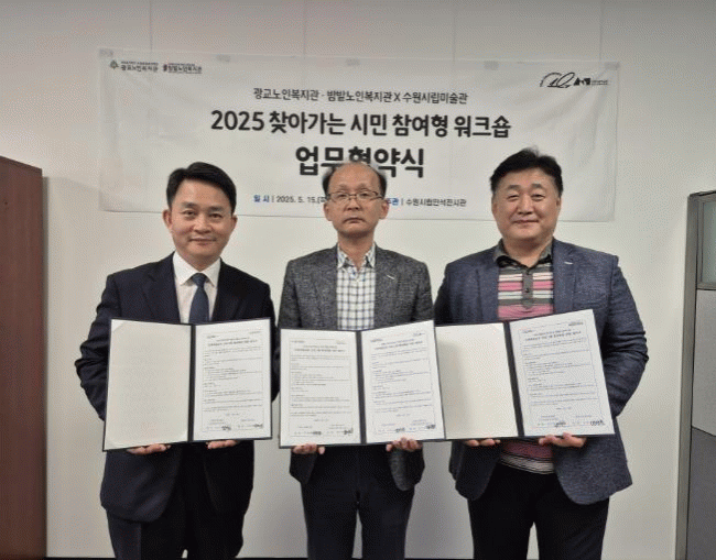 [NWS¹æ¼Û=Çѽ¸ñ ±âÀÚ]°æ±âµµ ¼ö¿ø½Ã¸³¹Ì¼ú°üÀº ¼ö¿ø½Ã ³ëÀÎ ¹®È­¿¹¼ú ÇâÀ¯±Ç È®´ë¸¦ À§ÇØ °ü³» ±¤±³³ëÀκ¹Áö°ü. ¹ã¹ç³ëÀκ¹Áö°ü°ú 15ÀÏ ¾÷¹«Çù¾àÀ» ü°áÇß´Ù. ¼ö¿ø½Ã¸³¹Ì¼ú°ü¿¡¼­ ÁøÇàµÈ Çù¾à½Ä¿¡´Â ³²±â¹Î ¼ö¿ø½Ã¸³¹Ì¼ú°üÀå, ¼­´ö¿ø ±¤¡¦