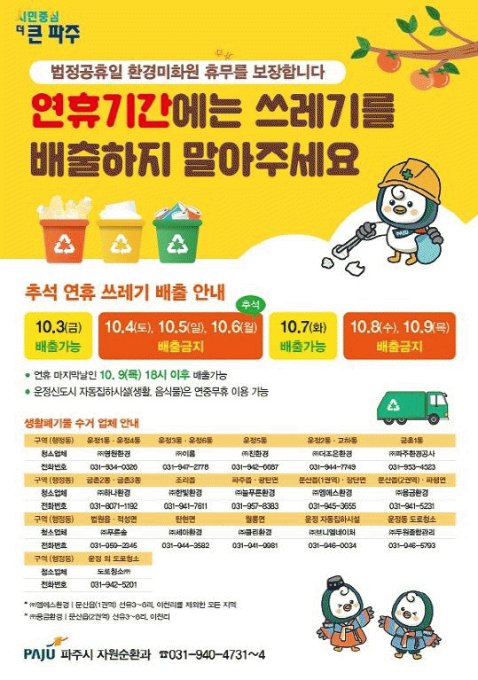 [»çȸ] ÆÄÁÖ½Ã, Ãß¼® ¿¬ÈÞ ±â°£ ¾²·¹±â ¹èÃâÀº Àá½Ã ¸ØÃçÁÖ¼¼¿ä |2025. 09.29