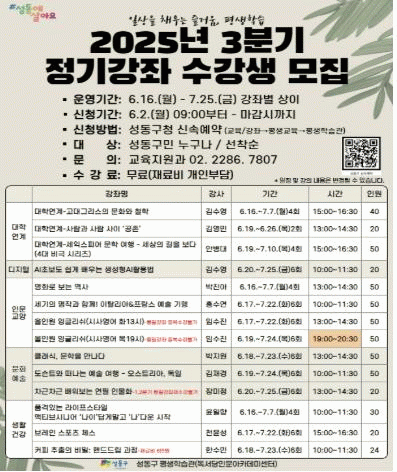 [NWS¹æ¼Û=Çѽ¸ñ ±âÀÚ]¼­¿ï ¼ºµ¿±¸°¡ 2025³â 3ºÐ±â Æò»ýÇнÀ°ü Á¤±â°­Á ¼ö°­»ýÀ» ¸ðÁýÇÑ´Ù. Á¢¼ö´Â 6¿ù 2ÀÏ(¿ù) ¿ÀÀü 9½ÃºÎÅÍ ¼ºµ¿±¸Ã» ½Å¼Ó¿¹¾à ´©¸®Áý¿¡¼­ ¼±Âø¼øÀ¸·Î ÁøÇàµÈ´Ù. À̹ø 3ºÐ±â¿¡´Â ´ëÇп¬°è Àι®ÇÐ, »ý¼ºÇü AI, »ýȰ¹®È­¡¦