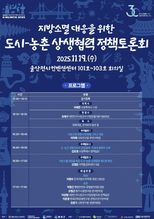 [NWS¹æ¼Û=Çѽ¸ñ ±âÀÚ]µµ½Ã¿Í ³óÃÌÀÌ ÇÔ²² Áö¼Ó°¡´ÉÇÑ ¹Ì·¡¸¦ ¼³°èÇÏ´Â ³íÀÇÀÇ ÀåÀÌ ¿­¸°´Ù. ¼ö¿øÆ¯·Ê½Ã(½ÃÀå ÀÌÀçÁØ)´Â 11¿ù 19ÀÏ ¿ÀÈÄ 4½Ã ¿ï»êÀü½ÃÄÁº¥¼Ç¼¾ÅÍ 1Ãþ¿¡¼­ ¡®Áö¹æ¼Ò¸ê ´ëÀÀÀ» À§ÇÑ µµ½Ã-³óÃÌ »ó»ýÇù·Â Á¤Ã¥Åä·Ðȸ¡¯¸¦ °³ÃÖ¡¦
