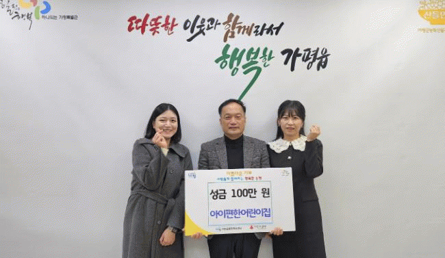 [NWS¹æ¼Û=Çѽ¸ñ ±âÀÚ]°¡Æò ¾ÆÀÌÆíÇѾÀÌÁýÀº Áö³­ 9ÀÏ °¡ÆòÀ¾ ÇàÁ¤º¹Áö¼¾Å͸¦ ¹æ¹®ÇØ ÀÌ¿ôµ½±â ¼º±Ý 100¸¸ ¿øÀ» Àü´ÞÇß´Ù. Á¤¹Ì¿µ ¿øÀåÀº ¡°Áö³­ÇØ ¾î¸°ÀÌÁýÀÌ °³¿øÇØ Ã¹ ±âºÎ¸¦ ½ÃÀÛÀ¸·Î ¿ÃÇØµµ À̾ ±âºÎÇÒ ¼ö ÀÖ¾î °¨»çÇÏ°Ô »ý°¢¡¦