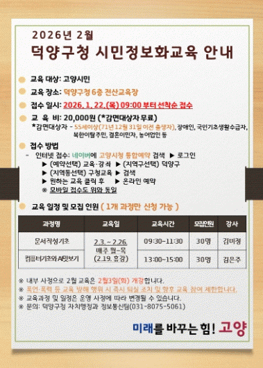 [»çȸ] °í¾ç½Ã ´ö¾ç±¸, 2026³â Á¦1Â÷ ½Ã¹ÎÁ¤º¸È­±³À° ¼ö°­»ý ¸ðÁý |2026. 01.19