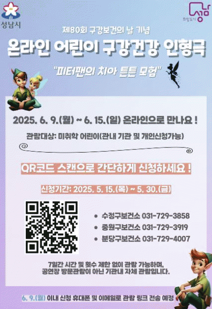 [NWS¹æ¼Û=Çѽ¸ñ ±âÀÚ]¼º³²½Ã ¿À´Â 5¿ù 30ÀϱîÁö ¿Â¶óÀÎ ±¸°­ °Ç°­ ÀÎÇü±Ø ¡®ÇÇÅÍÆÒÀÇ Ä¡¾Æ ưư ¸ðÇ衯 °ø¿¬ °ü¶÷ ½ÅûÀ» ¹Þ´Â´Ù. Á¦80ȸ ±¸°­º¸°ÇÀÇ ³¯(6.9)À» ¸Â¾Æ ¾î¸°À̵鿡°Ô ¿Ã¹Ù¸¥ ±¸°­°Ç°­ ½À°üÀ» ±â¸£´Â °è±â¸¦ ¸¶·ÃÇØ ÁÖ·Á°í¡¦