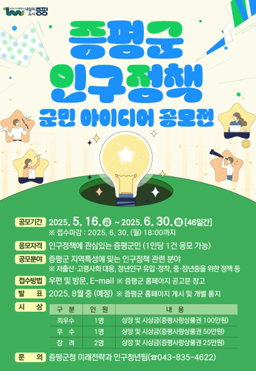 [NWS¹æ¼Û=Çѽ¸ñ ±âÀÚ]ÃæºÏ ÁõÆò±ºÀÌ Àα¸°¨¼Ò ¹®Á¦¿¡ ´Éµ¿ÀûÀ¸·Î ´ëÀÀÇϰí Áö¿ª Ư¼º¿¡ ¸Â´Â Á¤Ã¥À» ¹ß±¼Çϱâ À§ÇØ Àα¸Á¤Ã¥ ±º¹Î ¾ÆÀ̵ð¾î °ø¸ðÀüÀ» °³ÃÖÇÑ´Ù. °ø¸ð ±â°£Àº 5¿ù 16ÀϺÎÅÍ 6¿ù 30ÀϱîÁö´Ù. °ø¸ð ÁÖÁ¦´Â ¡âÀúÃâ»ê¡¤°í·É¡¦