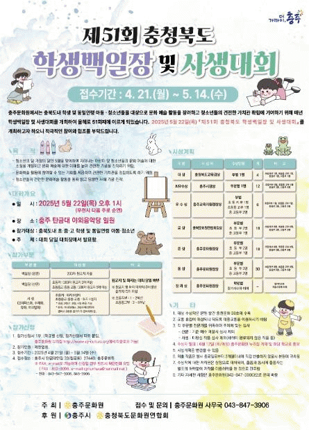 [NWS¹æ¼Û=Çѽ¸ñ ±âÀÚ]ÃæºÏ µµ³» û¼Ò³âµéÀÇ Ã¢ÀǷ°ú ¿¹¼úÀû °¨¼ºÀ» ÆîÄ¡´Â ÀåÀÌ ¿­¸°´Ù. ÃæÁÖ¹®È­¿øÀº ¿À´Â 5¿ù 22ÀÏ ÃæÁÖ Åº±Ý´ë ¾ß¿ÜÀ½¾Ç´ç ÀÏ¿ø¿¡¼­ ¡®Á¦51ȸ ÃæÃ»ºÏµµ Çлý¹éÀÏÀå ¹× »ç»ý´ëȸ¡¯¸¦ °³ÃÖÇÑ´Ù°í ¹àÇû´Ù. ÃæÁÖ½Ã¿Í Ãæ¡¦