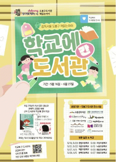 [NWS¹æ¼Û=Çѽ¸ñ ±âÀÚ]¼­¿ï µµºÀ±¸°¡ Áö¿ª ³» 8°³ µµ¼­°üÀÌ 5¿ù 16ÀϺÎÅÍ 6¿ù 27ÀϱîÁö ±Ç¿ªº° ÃʵîÇб³ 8°³±³¿¡¼­ µ¶¼­ÇÁ·Î±×·¥(¡®Çб³¿¡ °£ µµ¼­°ü¡¯)À» ÁøÇàÇÑ´Ù°í ¹àÇû´Ù. ÇÁ·Î±×·¥À» ÅëÇØ µµ¼­°üÀº ÃʵîÇлýµé¿¡°Ô »õ·Î¿î µ¶¼­ °æÇ衦
