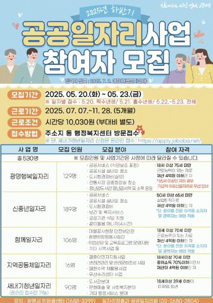 [NWS¹æ¼Û=Çѽ¸ñ ±âÀÚ]±¤¸í½Ã´Â Ãë¾÷ Ãë¾à°èÃþÀÇ »ý°è ¾ÈÁ¤°ú ¹Î»ý°æÁ¦ ȸº¹À» Áö¿øÇϱâ À§ÇØ 5¿ù 20ÀϺÎÅÍ 23ÀϱîÁö ¡®2025³â ÇϹݱ⠰ø°ø ÀÏÀÚ¸® »ç¾÷¡¯ Âü¿©ÀÚ 530¸íÀ» ¸ðÁýÇÑ´Ù. 2025³â ÇϹݱ⠰ø°ø ÀÏÀÚ¸® »ç¾÷Àº ¡ã±¤¸í Çູ ÀÏÀÚ¡¦