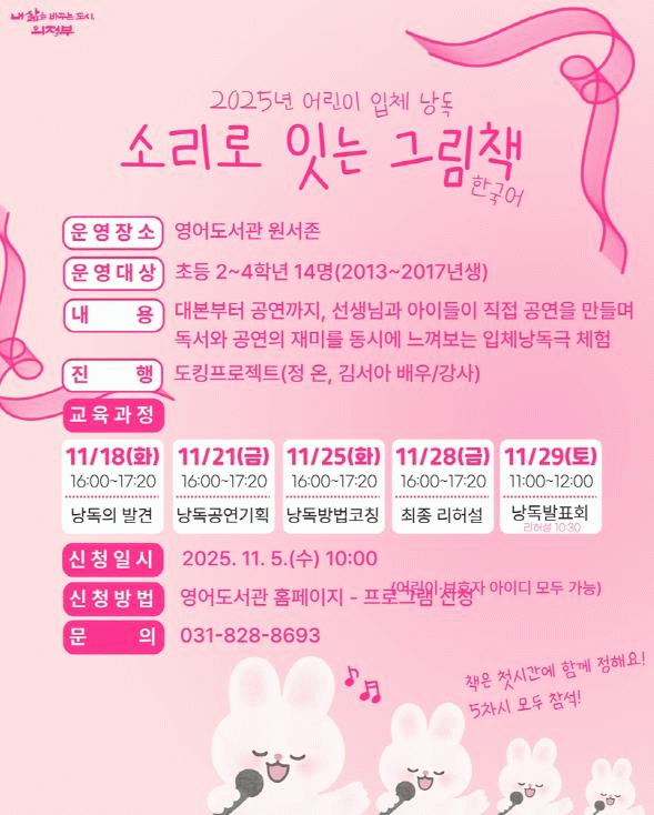 [NWS¹æ¼Û=Çѽ¸ñ ±âÀÚ]ÀÇÁ¤ºÎ½Ã µµ¼­°üÀº 11¿ù, 2025³â ¾î¸°ÀÌ ÀÔü³¶µ¶ ¡®¼Ò¸®·Î ÀÕ´Â ±×¸²Ã¥¡¯À» ÃÑ 5ȸ¿¡ °ÉÃÄ ÀÇÁ¤ºÎ¿µ¾îµµ¼­°ü¿¡¼­ ¿î¿µÇÑ´Ù. ¼Ò¸®·Î ÀÕ´Â ±×¸²Ã¥Àº ¾ÆÀ̵éÀÌ Çѱ¹¾î ±×¸²Ã¥À» ³¶µ¶Çϰí Á÷Á¢ °ø¿¬À» ±âȹÇϸ鼭 µ¶¼­¡¦