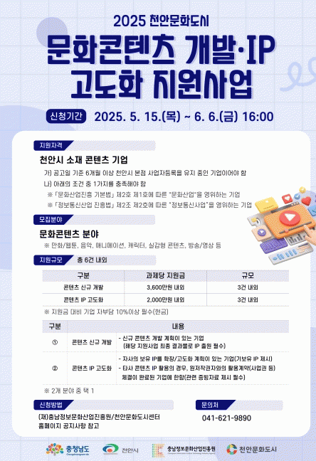 [°æÁ¦] (Àç)Ãæ³²Á¤º¸¹®È­»ê¾÷ÁøÈï¿ø 2025 õ¾È¹®È­µµ½Ã ¹®È­ÄÜÅÙÃ÷ °³¹ß¡¤IP°íµµÈ­ Áö¿ø»ç¾÷ Âü¿©±â¾÷ ¸ðÁý |2025. 05.15