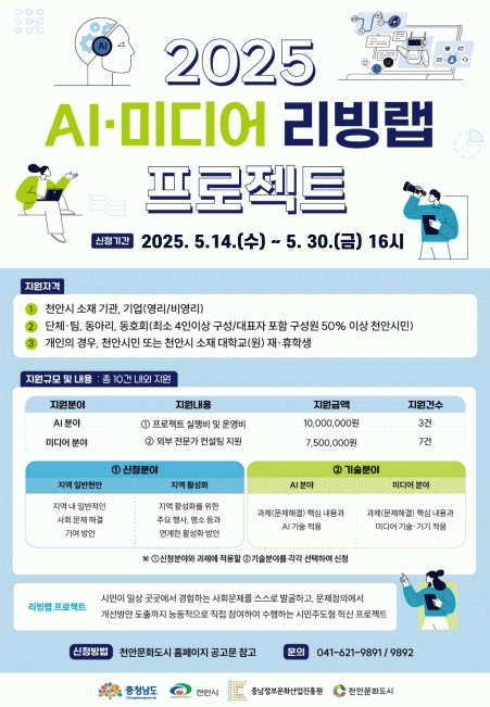 [NWS¹æ¼Û=ÇãÀº¼­ ±âÀÚ] (Àç)Ãæ³²Á¤º¸¹®È­»ê¾÷ÁøÈï¿øÀº ¿À´Â 5¿ù 30ÀϱîÁö õ¾ÈÀÇ Áö¿ª »çȸ ¹®Á¦ ÇØ°á¿¡ ÁÖ¹ÎÀÌ ÇÔ²² Âü¿©ÇÏ´Â ¡®AI¡¤¹Ìµð¾î ¸®ºù·¦ ÇÁ·ÎÁ§Æ®¡¯ Âü°¡ÀÚ¸¦ Ãß°¡ ¸ðÁýÇÑ´Ù°í ¹àÇû´Ù. ¸®ºù·¦(Living Lab)Àº ½Ã¹ÎÀÌ Àϻ󿡼­¡¦
