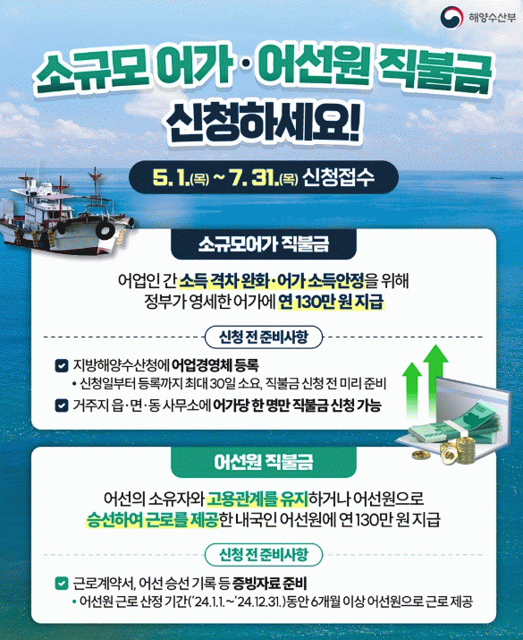 [NWS¹æ¼Û=Çѽ¸ñ ±âÀÚ]¿©¼ö½Ã´Â ¾î¾÷ÀÎÀÇ ¼Òµæ¾ÈÁ¤À» À§ÇØ ¼ö»ê°øÀÍÁ÷ºÒ±Ý ½ÅûÀ» ¿À´Â 7¿ù 31ÀϱîÁö Á¢¼öÇÑ´Ù°í ¹àÇû´Ù. ¼ö»ê°øÀÍÁ÷ºÒÁ¦´Â ¡ã¼Ò±Ô¸ð¾î°¡ Á÷ºÒ±Ý ¡ã¾î¼±¿ø Á÷ºÒ±Ý ¡ãÁ¶°ÇºÒ¸®Áö¿ª Á÷ºÒ±Ý µî 3Á¾À¸·Î, ½ÅûÀº °ÅÁÖÁö³ª ½Â¡¦