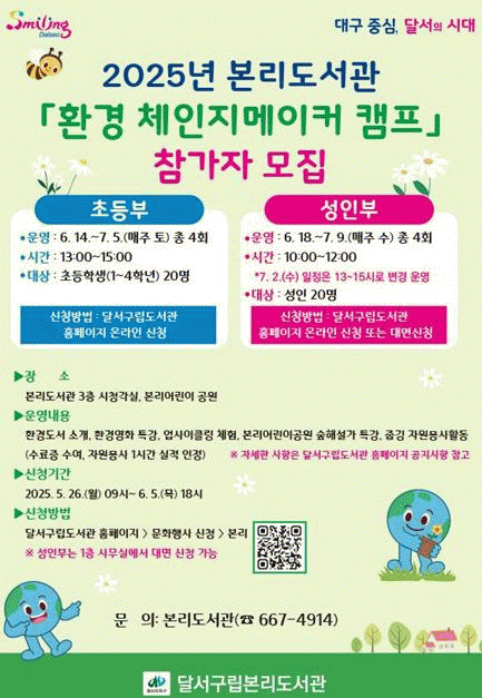 [»çȸ] ´Þ¼­±¸¸³º»¸®µµ¼­°ü, '2025³â ȯ°æ üÀÎÁö¸ÞÀÌÄ¿ Ä·ÇÁ'Âü°¡ÀÚ ¸ðÁý |2025. 05.15