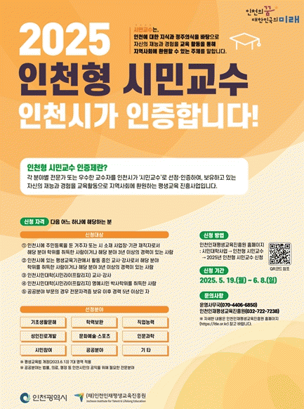 [NWS¹æ¼Û=Çѽ¸ñ ±âÀÚ] ÀÎõÀÎÀçÆò»ý±³À°ÁøÈï¿øÀº Áö¿ª»çȸ¿¡ Àç´É°ú °æÇèÀ» ȯ¿øÇÒ ¼ö ÀÖ´Â ¡®2025³â ÀÎõÇü ½Ã¹Î±³¼ö¡¯¸¦ ¿À´Â 19ÀϺÎÅÍ ¸ðÁýÇÑ´Ù°í ¹àÇû´Ù. ¡®ÀÎõÇü ½Ã¹Î±³¼ö ÀÎÁõÁ¦¡¯´Â ½Ã¹ÎÀÌ ÀÚ½ÅÀÇ Àü¹®¼ºÀ» ¹ÙÅÁÀ¸·Î ±³À° Ȱµ¿¡¦