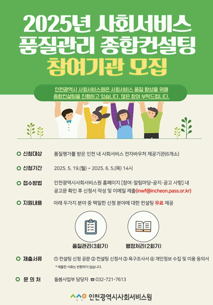 [NWS¹æ¼Û=Çѽ¸ñ ±âÀÚ]ÀÎõ±¤¿ª½Ã´Â »çȸ¼­ºñ½º¿øÀ» ÅëÇØ ÀüÀÚ¹Ù¿ìó Á¦°ø±â°üÀ» ´ë»óÀ¸·Î ¡®2025³â »çȸ¼­ºñ½º ǰÁú°ü¸® Á¾ÇÕÄÁ¼³ÆÃ¡¯À» ½Ç½ÃÇÑ´Ù°í ¹àÇû´Ù. À̹ø ÄÁ¼³ÆÃÀº ¹Î°£±â°üÀÌ Á¦°øÇÏ´Â »çȸ¼­ºñ½ºÀÇ Ç°ÁúÀ» ³ôÀ̱â À§ÇÑ ¸ñÀûÀ¸¡¦