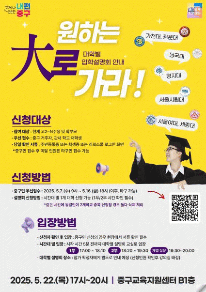 [»çȸ] ¿øÇÏ´Â ´ë(ÓÞ)·Î °¡¶ó! ¼­¿ï Áß±¸, 2026Çг⵵ ´ëÇк° ÀÔÇм³¸íȸ °³ÃÖ |2025. 05.15