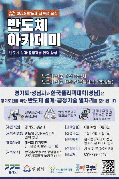 [NWS¹æ¼Û=Çѽ¸ñ ±âÀÚ]¼º³²½Ã´Â ¿À´Â 6¿ù 5ÀϱîÁö ¡®2025³â ¹ÝµµÃ¼ ¼³°è¡¤°øÁ¤±â¼ú ¾ÆÄ«µ¥¹Ì¡¯ ±³À°»ýÀ» ¸ðÁýÇÑ´Ù. ÇØ´ç ¾ÆÄ«µ¥¹Ì´Â ¼º³²½Ã¿Í °æ±âµµ, Çѱ¹Æú¸®ÅØ´ëÇÐÀÌ Çù·ÂÇØ ¹ÝµµÃ¼ »ê¾÷¿¡ ÇÊ¿äÇÑ ¼³°è ¹× °øÁ¤±â¼ú ÀÎÀ縦 ¾ç¼ºÇϰí,¡¦