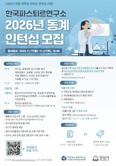 [NWS¹æ¼Û=Çѽ¸ñ ±âÀÚ]¼º³²½Ã°¡ ¡®2026³â µ¿°è ´ëÇлý ¹ÙÀÌ¿À ÀÎÅÏ½Ê ÇÁ·Î±×·¥¡¯ Âü°¡ÀÚ 5¸íÀ» ¸ðÁýÇÑ´Ù. Çѱ¹ÆÄ½ºÅ𸣿¬±¸¼Ò°¡ ÁÖ°üÇÏ°í ¼º³²½Ã°¡ Áö¿øÇÏ´Â À̹ø ÇÁ·Î±×·¥Àº ¹ÙÀÌ¿À»ê¾÷ ºÐ¾ß ÀÎÀç ¾ç¼ºÀ» À§ÇÑ º¸Á¶»ç¾÷À¸·Î, ¼º³² °ÅÁÖ¡¦