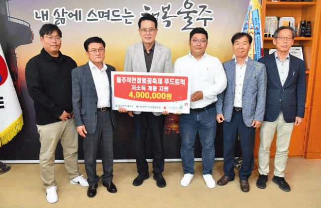 [NWS¹æ¼Û=Çѽ¸ñ ±âÀÚ]¿ï»ê û³âǪµåÆ®·°Çùµ¿Á¶ÇÕ ÀÌ¿ëÁÖ ´ëÇ¥°¡ 14ÀÏ ¿ïÁÖ±ºÃ» ¼ÒȸÀǽǿ¡¼­ À̼ø°É ±º¼ö¿Í ¿ïÁÖÀÛõÁ¤º¢²ÉÃàÁ¦ÃßÁøÀ§¿øÈ¸ ¹Ú¼ø¸ñ À§¿øÀå µîÀÌ Âü¼®ÇÑ °¡¿îµ¥ ¼º±Ý 400¸¸¿øÀ» Àü´ÞÇß´Ù. ¿ï»ê û³âǪµåÆ®·°Àº ¿ÃÇØ Á¦6ȸ¡¦