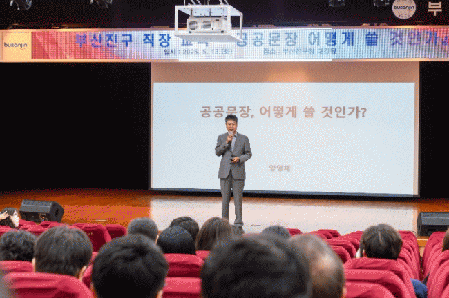 [NWS¹æ¼Û=Çѽ¸ñ ±âÀÚ] ºÎ»ê ºÎ»êÁø±¸´Â 5¿ù 13ÀÏ ¿ÀÀü, ¿ÀÈÄ·Î ½Ã°£À» ³ª´©¾î Àü Á÷¿øÀ» ´ë»óÀ¸·Î ¡®°ø°ø¹®Àå ¾î¶»°Ô ¾µ °ÍÀΰ¡¡¯¶ó´Â ÁÖÁ¦·Î ±³À°À» ½Ç½ÃÇß´Ù°í ¹àÇû´Ù. °ø°ø¹®ÀåÀ» º¸´Ù Á¤È®ÇÏ°í ½±°Ô »ç¿ëÇØ ±¸¹Îµé°ú ´õ¿í ¿øÈ°ÇÏ¡¦