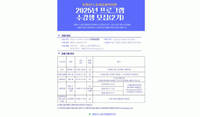 [NWS¹æ¼Û=Çѽ¸ñ ±âÀÚ]Å뿵½Ã´Â ½Ã¹ÎµéÀÇ °Ç°­ÇÑ »î°ú ¿©°¡È°µ¿À» Áö¿øÇϱâ À§ÇØ Å뿵½Ã ³ëµ¿ÀÚÁ¾ÇÕº¹Áö°ü¿¡¼­ 2025³â º¹Áö¡¤°Ç°­ ÇÁ·Î±×·¥ 2±â ¼ö°­»ýÀ» ¸ðÁýÇÑ´Ù°í 14ÀÏ ¹àÇû´Ù. À̹ø ÇÁ·Î±×·¥Àº Å뿵½Ã ³ëµ¿ÀÚ¿Í ½Ã¹ÎµéÀ» ´ë»óÀ¸·Î¡¦