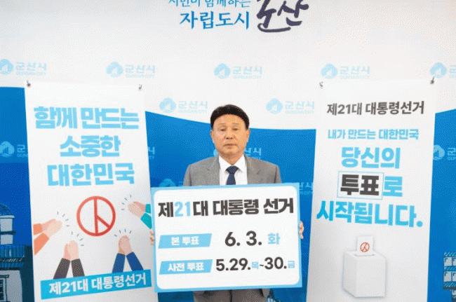 [NWS¹æ¼Û=Çѽ¸ñ ±âÀÚ]°­ÀÓÁØ ±º»ê½ÃÀåÀÌ 6¿ù 3ÀÏ ½Ç½ÃµÇ´Â Á¦21´ë ´ëÅë·É¼±°Å¸¦ ¾ÕµÎ°í ½Ã¹ÎµéÀÇ Àû±ØÀûÀÎ ÅõÇ¥ Âü¿©¸¦ µ¶·ÁÇÏ´Â Ä·ÆäÀÎÀ» Àü°³Çß´Ù. °­ ½ÃÀåÀº ¡°¼±°Å´Â ¿ì¸®ÀÇ ¹Ì·¡¸¦ °áÁ¤ÇÏ´Â Áß¿äÇÑ ¼±ÅÃÀÇ ¼ø°£¡±À̶ó¸ç, ¡°½Ã¹Î ¿©¡¦